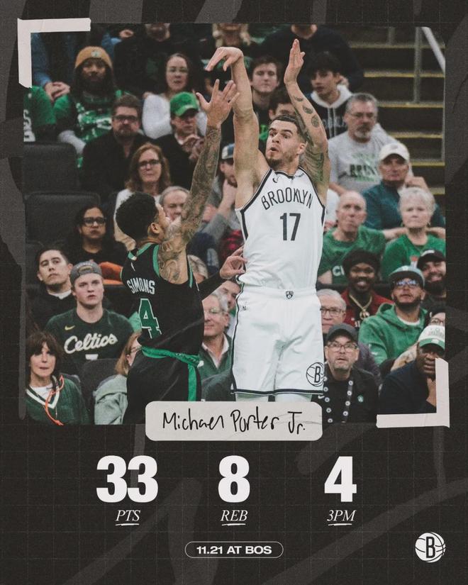 自从离开掘金,很少看到小迈克尔-波特的新闻。其实他最近打得不错,过去8场比赛,小波特在篮网场均砍下27.8分7.5篮板3.3助攻,投篮命中率50.3%,三分命中率40.6%。赛季至今,小波特打了14场比赛,其中5场砍下30+!